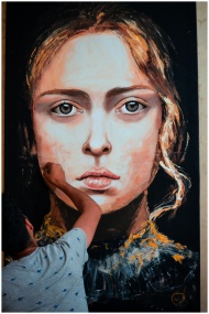 An artist meticulously paints a large portrait of