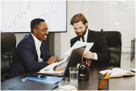 Two businessmen discussing documents in a modern office, fostering teamwork.