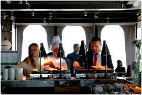 Business professionals enjoying a buffet meal in a contemporary indoor restaurant setting.