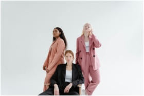 Three diverse businesswomen in stylish suits on a studio white background, exuding confidence.