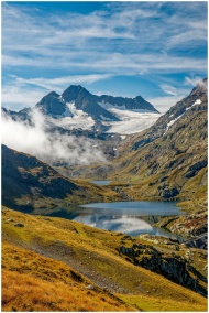 Breathtaking view of alpine mountains with snow and scenic lakes in a vibrant landscape.