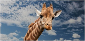 A close-up of a giraffe looking into the camera with a background of blue sky and clouds.
