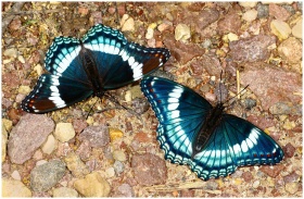 Beautiful display of two admiral butterflies resting on rocky ground, showcasing vibrant patterns.