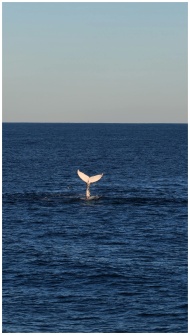 A majestic whale tail emerges from the sea at sunset off Byron Bay, Australia.