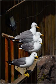 Four seagulls resting on a wooden structure in Erciş, Turkey, under bright sunlight.