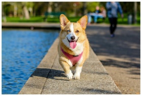 Cute corgi walking joyfully by the pond in the park on a sunny day.