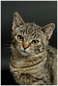 Charming close-up of a young tabby cat with striking eyes and soft fur.