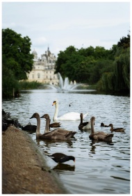 Beautiful day at St James's Park in London, featuring swans and lush greenery.