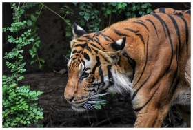 Close-up of a tiger in the wild, showcasing its majestic stripes and piercing eyes.