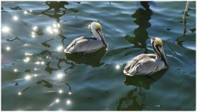 Peaceful image of two pelicans swimming with sunlit reflections on water, showcasing wildlife serenity.