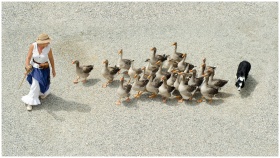 Aerial view of woman herding geese with a border collie on a gravel path.