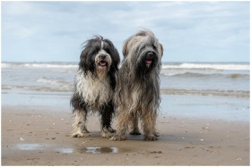 Two Tibetan Terrier dogs enjoying a playful day on the sandy beach at Noordwijk, Netherlands.