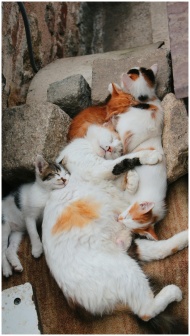 Adorable calico cats comfortably sleeping together on stone outdoors. Perfect for pet lovers.