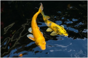 Two vibrant yellow koi fish gracefully swim in a tranquil pond, reflecting sunlight on the water's surface.