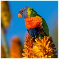A colorful rainbow lorikeet perched on orange flowers against a clear blue sky.