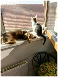 A cat and a dog bask in the sunlight by a window,