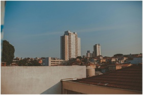 A scenic view of a city skyline with residential high-rise buildings under a clear sky at dusk.