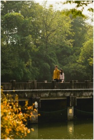 A couple enjoys a serene walk on a forest bridge s