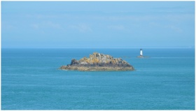Beautiful view of a rock island and distant lighthouse in Cancale, Bretagne, France.