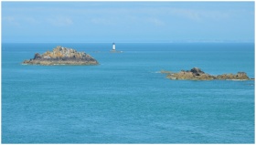 Serene view of rocky islands and lighthouse against blue sea in Cancale, Brittany, France.
