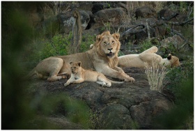 A family of lions resting on a rock in the wild savannah of South Africa.