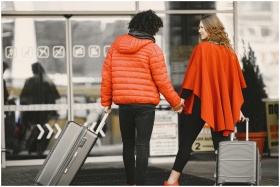 A couple holding hands with luggage, entering an airport for a travel journey.