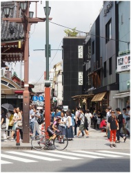 Lively urban street near Senso-ji Temple in Tokyo featuring cyclists and pedestrians exploring shops.