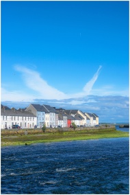 Picturesque row houses by the sea in Galway, Ireland under a bright blue sky.
