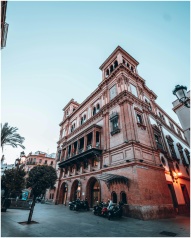 Capture of a historic architectural landmark in Seville, Spain at twilight with a clear sky.