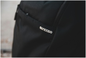 Minimalist close-up of a black backpack featuring incase branding, perfect for travel and style.