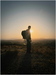Silhouette of a hiker with backpack in a vast land