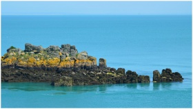 Beautiful rocky outcrop in the turquoise waters off Cancale, Bretagne, France.