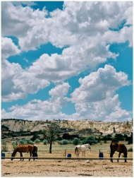 Grazing horses under the clear sky in rugged Cappadocia landscape, Türkiye.