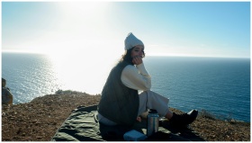 A woman relaxes on a clifftop, overlooking the oce