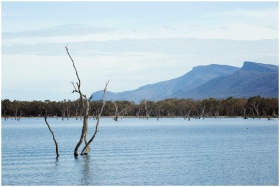 Serene scene of Lake Fyans with dead trees and mountain view in Victoria, Australia.