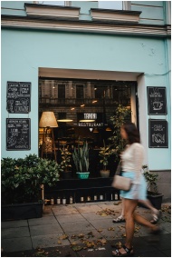 Captivating restaurant facade with greenery and passing pedestrian, showcasing urban outdoor atmosphere.
