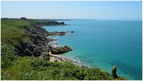 Breathtaking seascape of Cancale's rocky cliffs and turquoise sea under clear skies.