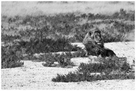 A majestic lion lounging on the savannah, captured in black and white.