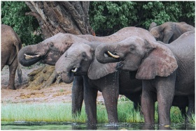 A herd of African elephants drinking water together in Botswana's lush wilderness.