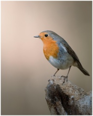 Close-up shot of European robin (Erithacus rubecula) perched on a rock with a soft background.