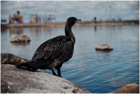 A great cormorant sits on a rock by the lakeshore, showcasing nature's elegance.