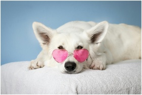 Adorable white dog wearing pink heart sunglasses o