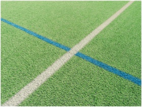 Close-up of intersecting white and blue lines on a vibrant green sports field grass surface.