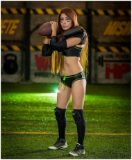 Strong female athlete in minimal sportswear holding a football on a well-lit indoor field.