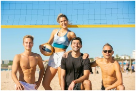 A group of adults enjoying a game of beach volleyball on a sunny day.