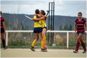 Two young female field hockey players celebrate on