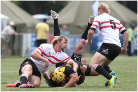 Rugby players in action during a competitive match on a grassy field.