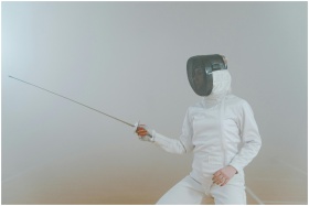 A female athlete in fencing gear striking an en garde pose in a foggy setting.