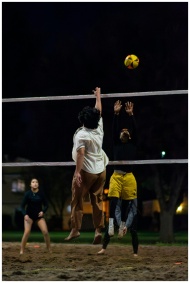 Dynamic volleyball game at night showcasing teamwo