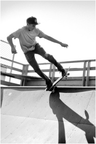Black and white action shot of a skateboarder perf
